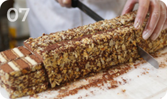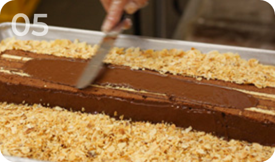 スポンジ菓子の味によって、純チョコレートやモカチョコレートを用いて重ねていきます。